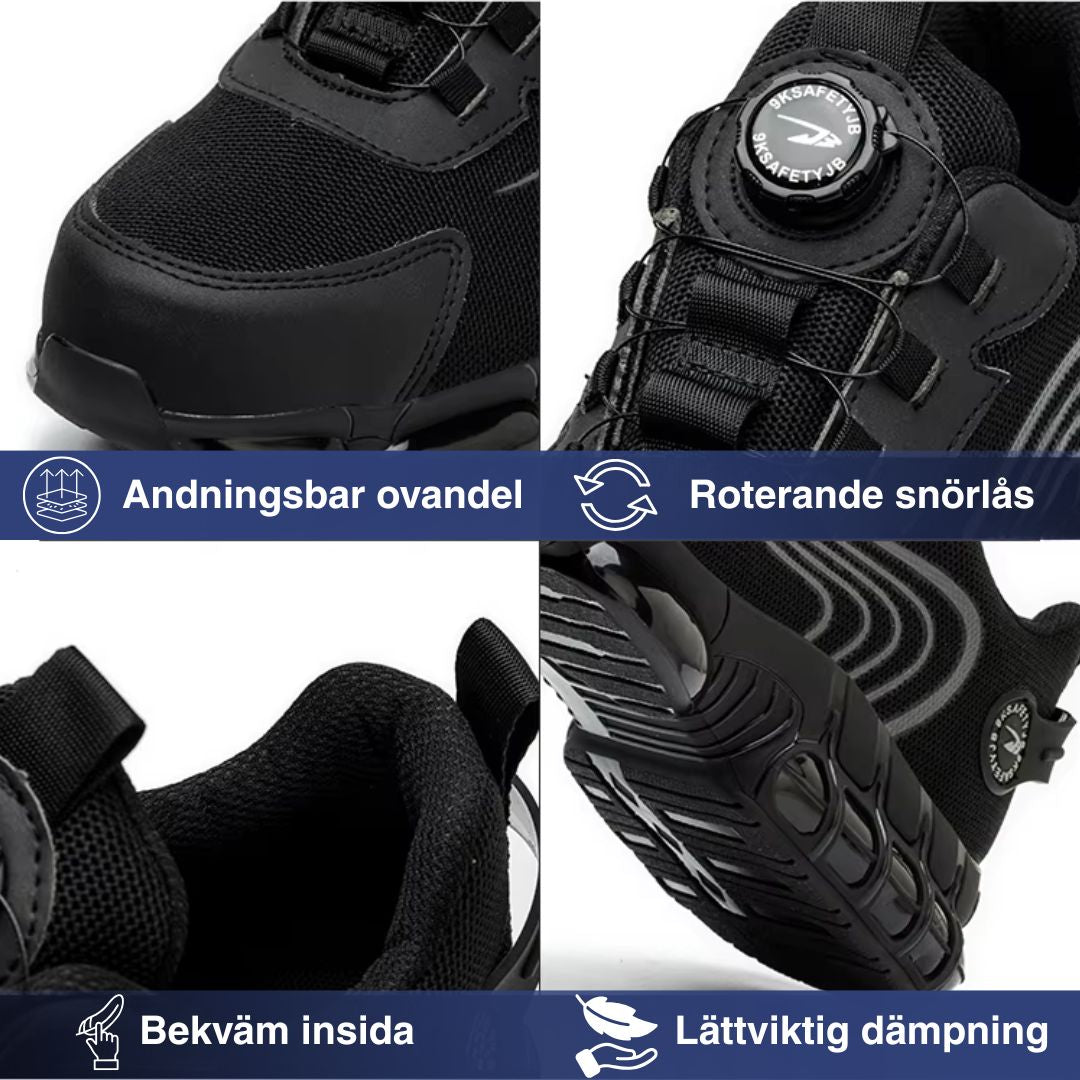 Skorna har en EU-certifierad stålkappa enligt EN ISO 20345, vilket ger ett stabilt skydd mot tunga föremål och tryck. Den stickresistenta sulan skyddar effektivt mot spikar, glas och andra vassa objekt på arbetsplatsen.