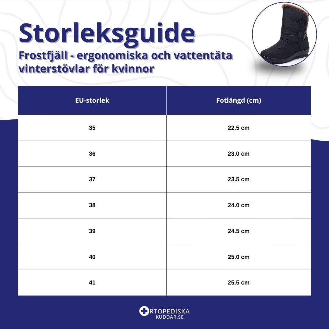 Hitta din perfekta passform med vår storleksguide för Frostfjäll – ergonomiska och vattentäta vinterstövlar för kvinnor.