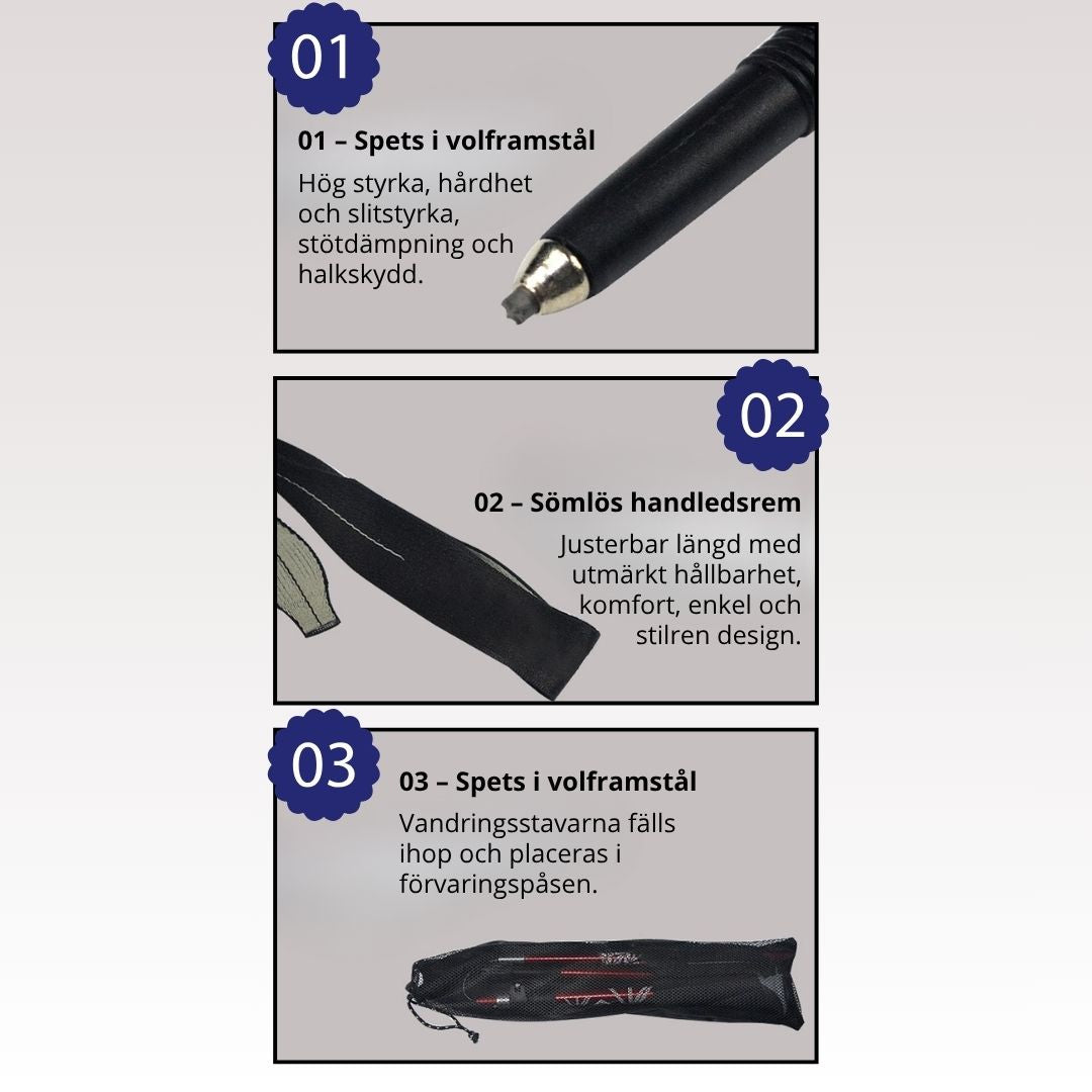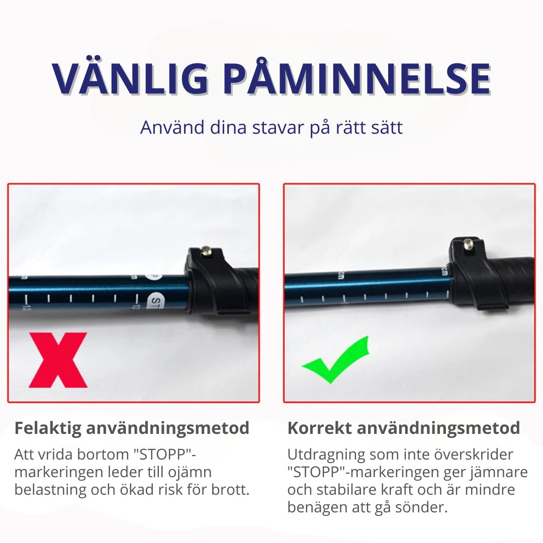 Lättviktskonstruktion (~280 g per stav) – minskar trötthet och gör dem enkla att använda