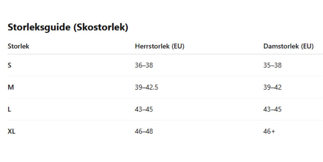 Finns i storlekar S–XL (EU 36–47).