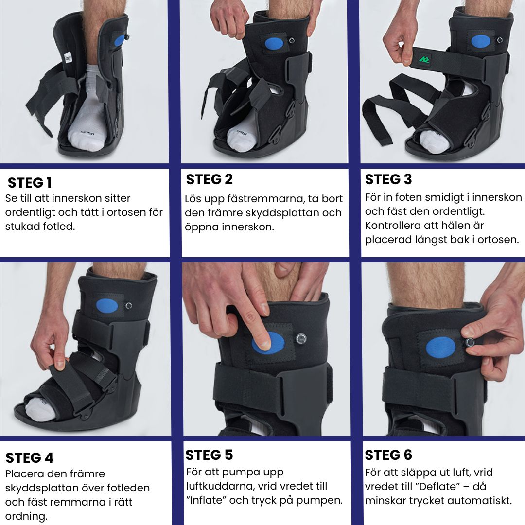 Lär dig hur du enkelt tar på och justerar din skyddssko med luftkammare för optimal komfort, stabilitet och återhämtning vid stukning eller fraktur. Följ stegen nedan för korrekt användning.